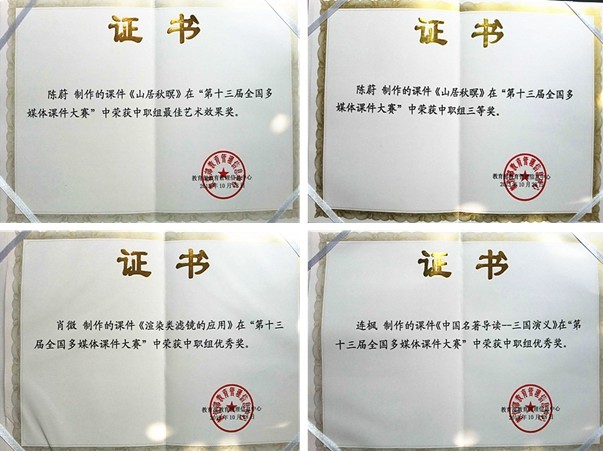 2013年3月,由教育部教育管理信息中心主辦的“第十三屆全國多媒體課件大賽活動”開始在全國范圍內面向各級各類院校教師和信息技術人員征集參賽課件。我校隨即擇優選出陳蔚老師的《山居秋暝》、連楓老師的《中國名著導讀--三國演義》和肖微老師的《渲染類濾鏡的應用》三份課件參賽。在經歷了國賽評審組兩個多月的初審、復審后,連楓老師和肖微老師的作品獲得了國家優秀獎,陳蔚老師的作品則順利通過了復賽,入圍了全國現場決賽。