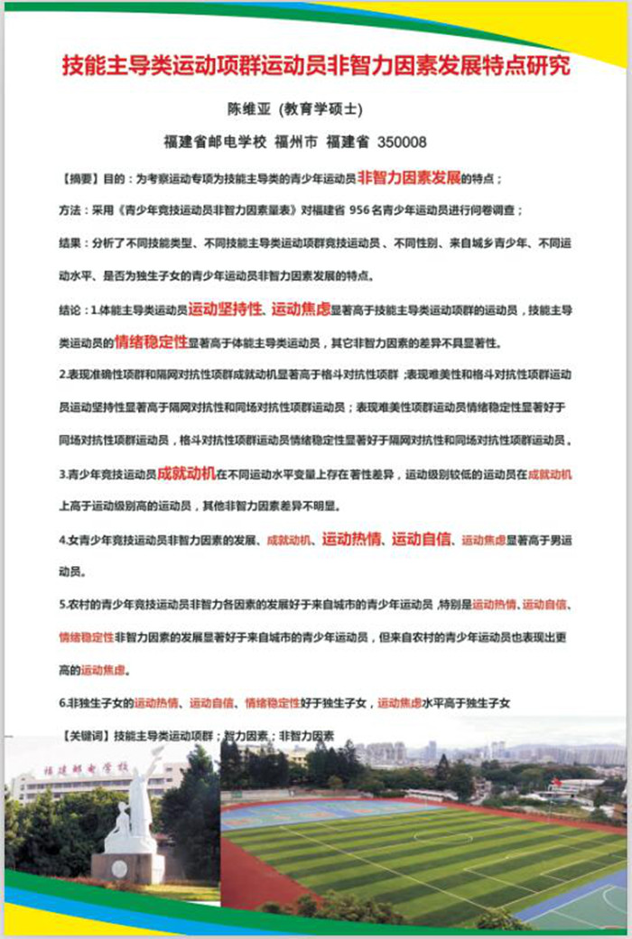近日,教育廳下發《福建省教育廳辦公室關于參加第十三屆全國學生運動會科學論文報告會的通知》,我校陳維亞老師撰寫的論文《技能主導類運動項群運動員非智力因素發展特點研究》在“第十三屆全國學生運動會科學論文”比賽中獲得二等獎,并受邀參加第十三屆全國學生運動會科學論文報告會。