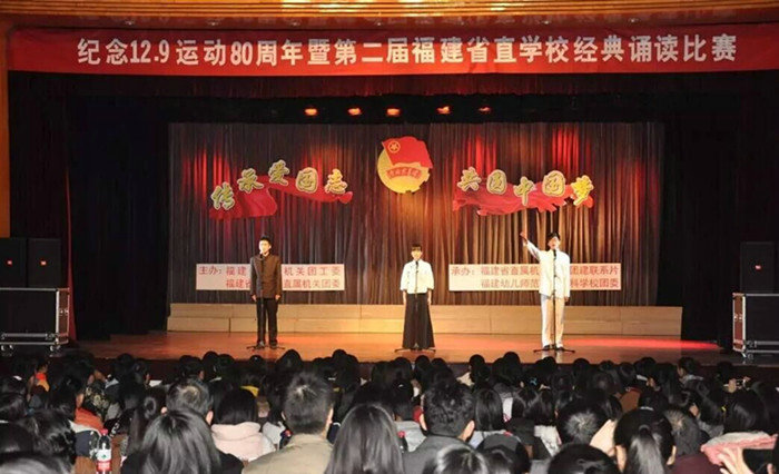 12月9日晚19:30,本次經典誦讀的匯報演出在福建幼兒師范高等專科學校禮堂舉行。福建省直機關工委邱榮副書記、省委教育工委劉劍津副書記等領導蒞臨現場觀看。匯演現場,包括我校在內的10支中高職優秀代表隊憑借著精彩紛呈的演繹,帶領大家重溫了中華經典作品的魅力,獲得了在場觀眾的一致好評。