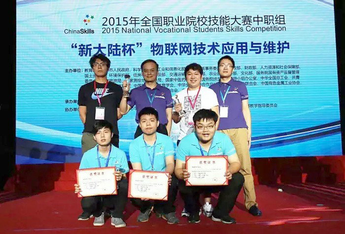 6月18日,由教育部、北京市人民政府、科學技術部、工業和信息化部等31家單位共同主辦,北京市教育委員會等單位承辦,北京新大陸時代教育科技有限公司、工業和信息化職業教育教學指導委員會等單位協辦的2015年全國職業院校技能大賽(中職組)“新大陸杯”物聯網技術應用與維護大賽在北京豐臺區園博園隆重舉行,來自全國28個省市79支參賽隊的237名選手匯聚一堂、比拼技能。我校代表隊憑借著扎實的功底和穩定的發揮,從近80支參賽隊中脫穎而出,勇奪團體二等獎,再一次展示了我校物聯網技術應用專業的教研水平以及我校師生奮發進取的精神風貌。