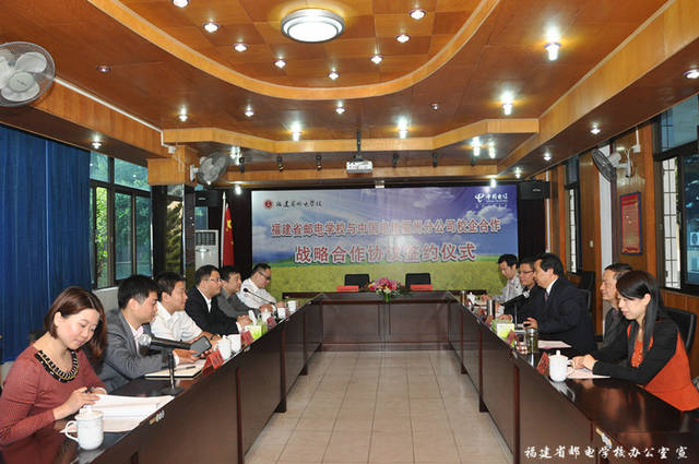 - 為進一步發揮校企雙方的優勢,為企業培養更多高素質高技能的應用型人才,為學生實習、實訓、就業提供更大的空間,5月8日上午,我校與中國電信股份有限公司福州分公司簽訂了校企戰略合作協議。我校王福貴校長、劉蘇軍副校長、謝福仁副校長、經管教學部李霓虹主任、團委張仁美書記與福州電信分公司陳展強副總經理、福建省電信技發公司洪文波副總經理、福州電信分公司政企部江林副主任、倉山區電信局何建東總經理及林景亮副總經理在第三會議室共同出席簽約儀式,劉蘇軍副校長和陳展強副總經理代表雙方發言并簽署協議書。