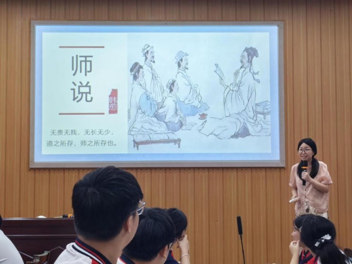 駱麗老師開設了題為《為師道吶喊:品<師說>中的千鈞深情》的公開課。課堂上,駱麗老師帶領學生品味《師說》中的文言虛詞,引導學生感受文字中的深刻情感。