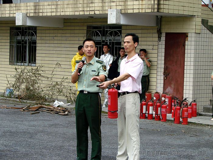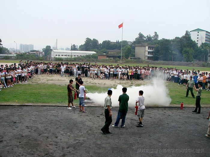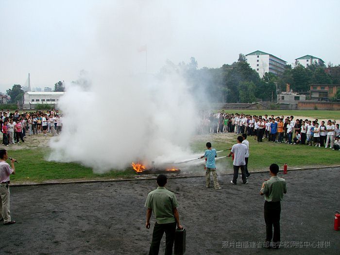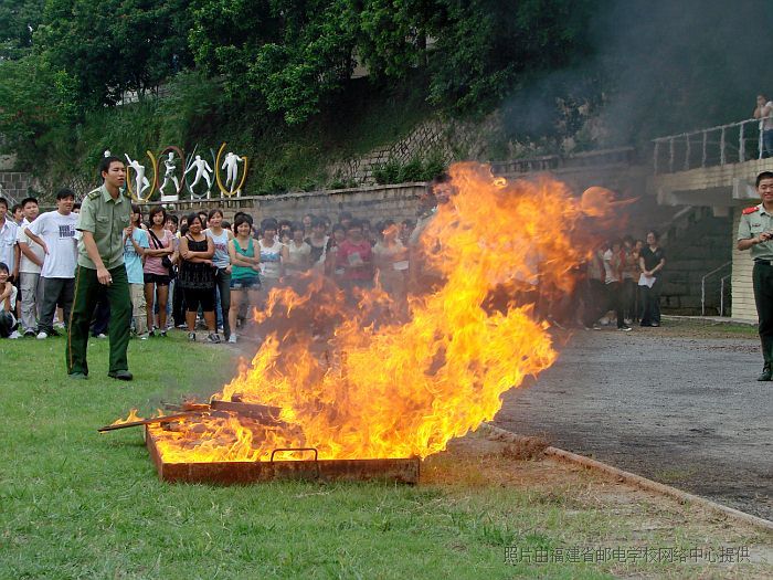 當天下午學校還邀請了倉山消防大隊8位官兵來校舉行消防安全講座和滅火演練。首先,全體08級新生集中在禮堂,由倉山消防大隊鄭教官給大家講火災的危害性、滅火方法、火場如何逃生、發生火災如何報警、校園防火安全注意事項等內容的防火安全講座。之后在學校操場進行滅火實戰演練,全體08級新生和部分教職工及學校保安都參加,消防官兵進行了示范,師生涌躍參與,針對部分師生的不規范的動作,鄭教官都作了詳細的講解和更正,使大家都掌握正確的滅火方法,使本次演練取得非常好的效果。